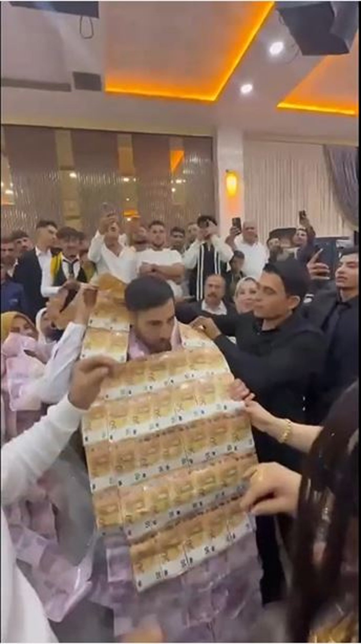 Gelin ve damadın üzeri banknotlarla kaplanırken, o anlar ise çevredekilerin cep telefonuyla görüntülendi.