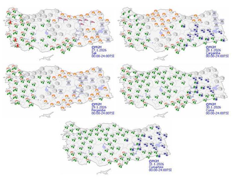 Ülkemizin kuzey, iç ve batı kesimlerinde çok bulutlu havanın etkili olması bekleniyor. Marmara, Ege ve Batı Akdeniz bölgeleri ile Eskişehir, Düzce, Zonguldak ve Karabük çevrelerinde yer yer yağmur ve sağanak yağışlar görülebilir. Kıyı Ege, Çanakkale, Balıkesir ve Antalya’da ise kuvvetli yağışlar tahmin ediliyor. Rüzgarın, Ege, Batı Akdeniz ve İç Anadolu’nun güneyinde güney yönlerden kuvvetli esmesi bekleniyor.