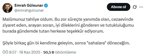 Dün tahliye edilen akademisyen Emrah Gülsunar, yaptığı ilk sosyal medya paylaşımında, yakında sahalara döneceğini açıkladı.